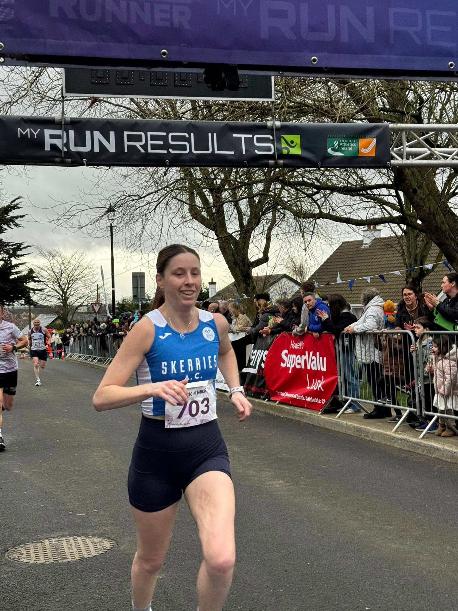 Tadgh Donnelly (Drogheda and District ) raced away for victory at theLusk 4-Mile on Sunday (March 1) with a time of 18 mins 38 secs. Ben Guiden (Clonliffe Harriers) was second in 19:22 and James Hyland (Raheny Shamrock AC) third in 19:49. Catherina Mullen (Metro St Brigid’s AC) was first woman in 22.00, followed by Sinead Farrell (LSA AC) in 22:24 and Patricia Ferguson (Skerries AC) in 24:29. In a tight battled for team honours, Clonliffe Harriers with 99 points beat Raheny Shamrock on 103 points. LSA AC, led by Joe Holt, was third, with Skerries AC fourth, host club Lusk AC fifth and Sportsworld AC sixth of the nineteen mixed teams entered.